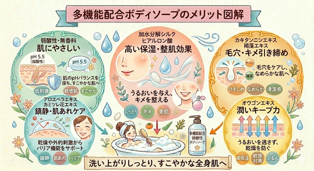 この商品は、7種類の保湿成分を配合しており、肌をしっかりと保湿しながらも、さっぱりとした洗い上がりを実現しています。